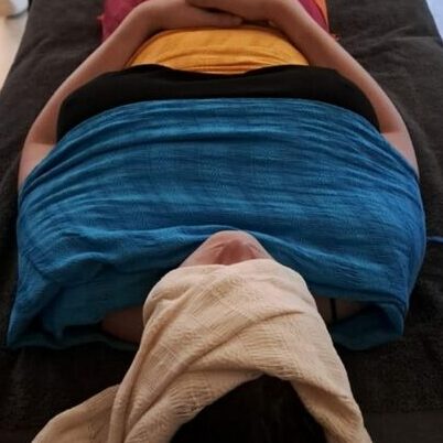 femme allongée les mains sur son ventre. Le haut de son visage est enveloppé dans un tissu beige, ses épaules dans un tissu bleu, elle porte un haut noir que l'on peut distinguer au niveau de sa poitrine, on voit un tissu jaune qui enveloppe son bassin et on aperçoit ensuite un autre tissu orange ou rouge. La photo de montre pas plus bas que le ventre.